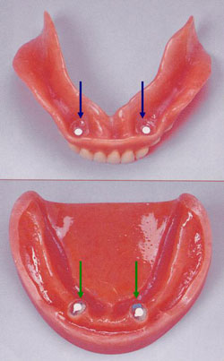 磁石(左の写真の矢印)を歯の根と入れ歯の内面に埋め込んで、磁力で入れ歯を吸着さるものです。内面に付着するタイプですので外観も良好です。